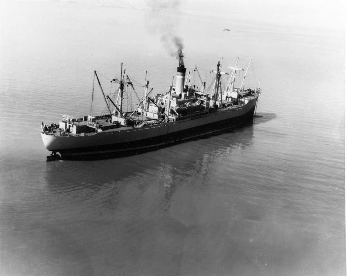 USNS Perseus (T-AF-64) under way, in San Francisco Bay, March 1963.