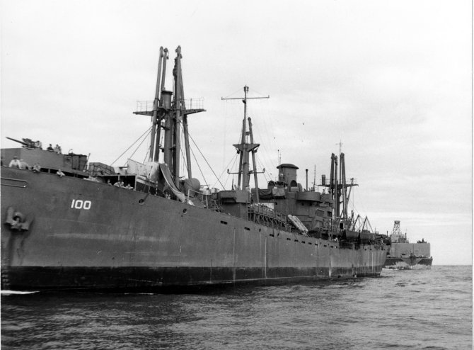 53k | Her “Liberty Ship” lines clearly apparent, USS Lynx (AK-100), part of a tank landing craft (LCT) secured as deck cargo forward,