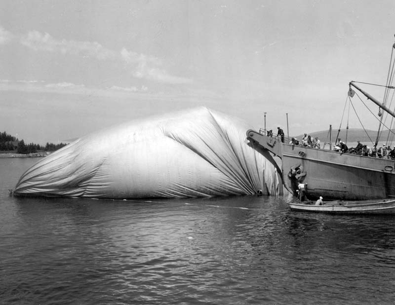 70k | USS Gum Tree (AN-18) assisting in salvage operation of K-14 blimp of Airship Patrol Squadron Eleven (ZP-11), NAS South Weymouth, MA., 6 July 1944, off Bar Harbor ME. US National Archives photo. |