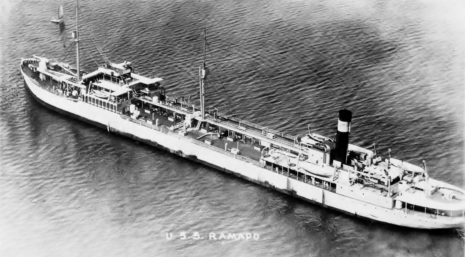 17k | USS Ramapo (AO-12) at anchor off Lahaina, T.H., 31 March 1938. The water is so calm and she has her cane fenders down. Photo taken from USS New Orleans (CA-32) as she is coming along side Ramapo.