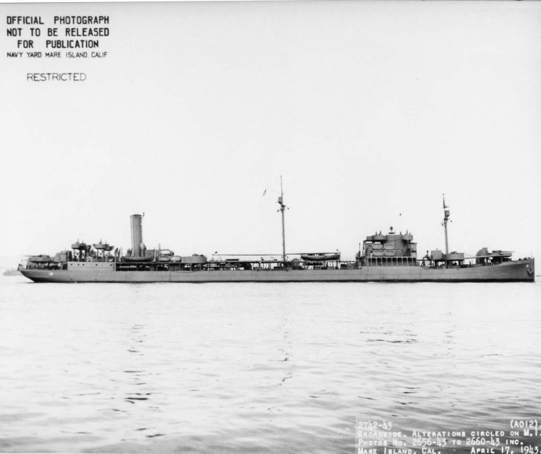 50k | USS Ramapo (AO-12) (broadside view) underway after departing Mare Island Navy Yard, 17 April 1943. Navy Yard Mare Island photo # 2742-43, 4/17/43. |