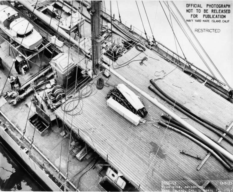 152k | USS Ramapo (AO-12) (plan view amidships) moored at Navy Yard Mare Island, Vallejo, CA., 15 April 1943. Ramapo was at Mare Island from 4 April until 16 April 1943. Navy Yard Mare Island photo # 2656-43, 4/15/43. |