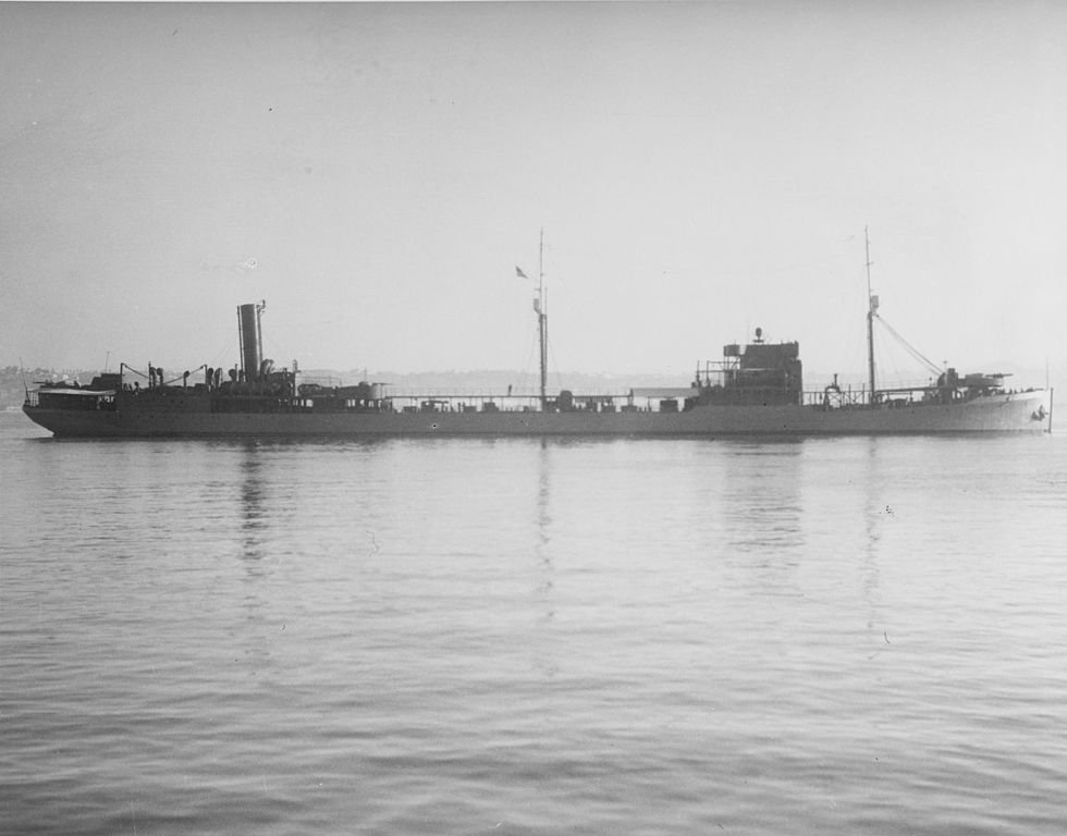 145k | USS Ramapo (AO-12) in San Francisco Bay, 17 April 1943. This view shows the very low freeboard of this flush decked tanker