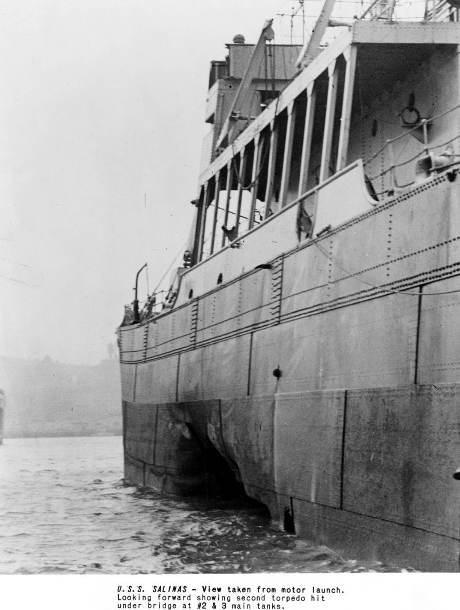188k | USS Salinas (AO-19) showing damage incurred when torpedoed, 30 October 1941. View taken from motor launch. Looking forward