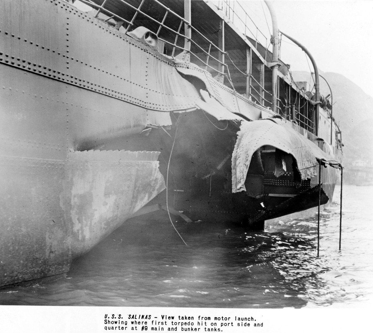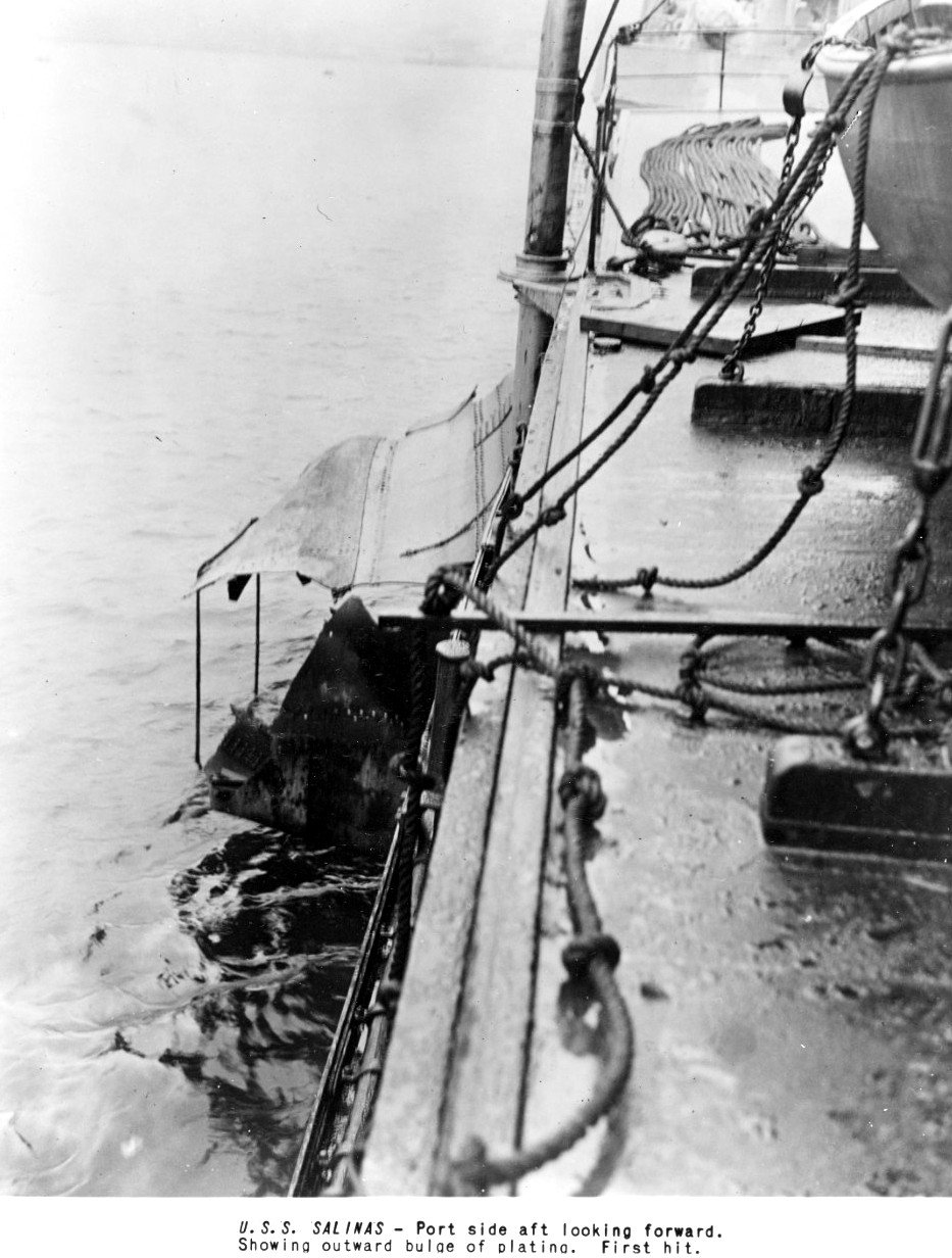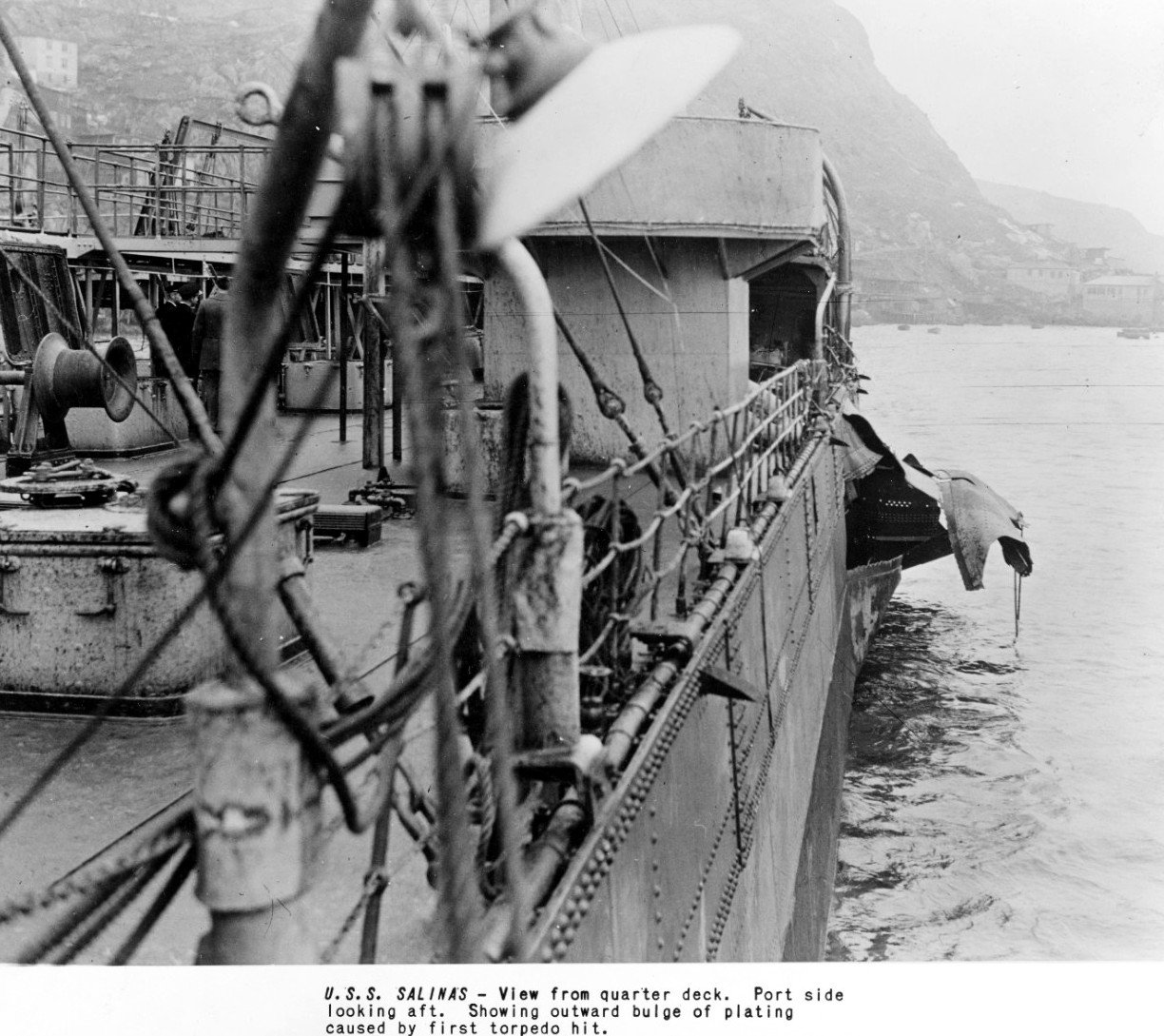 Showing outward bulge of plating caused by first torpedo hit. US Naval History and Heritage Command, Photo No. NH 108585 |