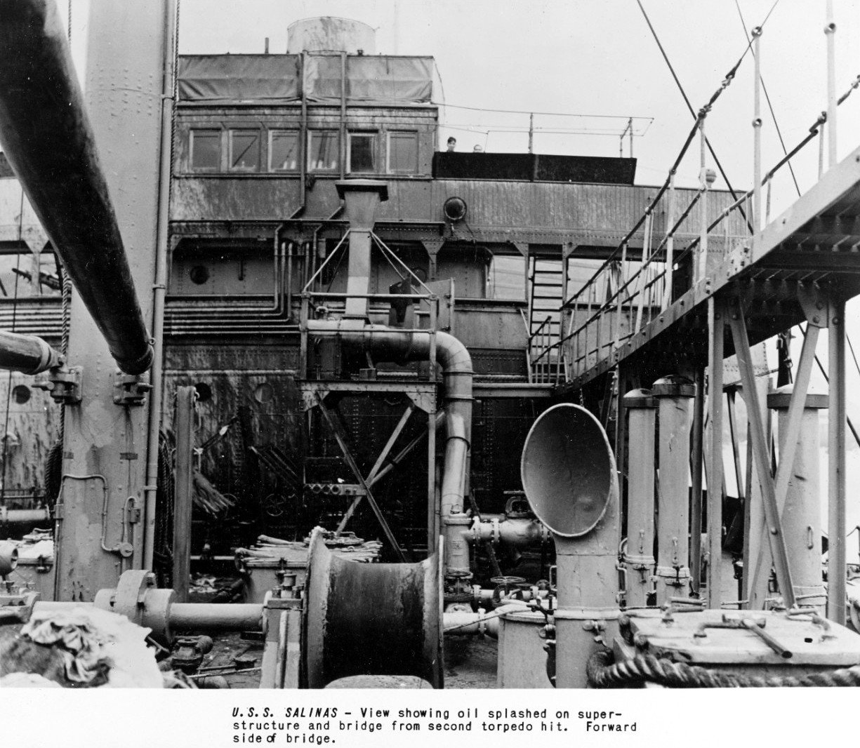 and bridge from second torpedo hit. Forward side of bridge. US Naval History and Heritage Command, Photo No. NH 108580 |
