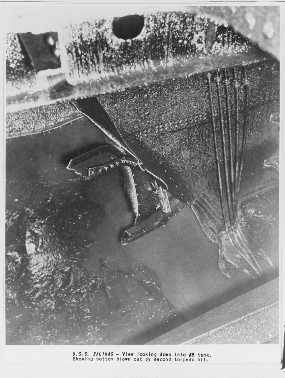 272k | USS Salinas (AO-19) showing damage incurred when torpedoed on 30 October 1941. View looking down into #8 tank. Showing bottom