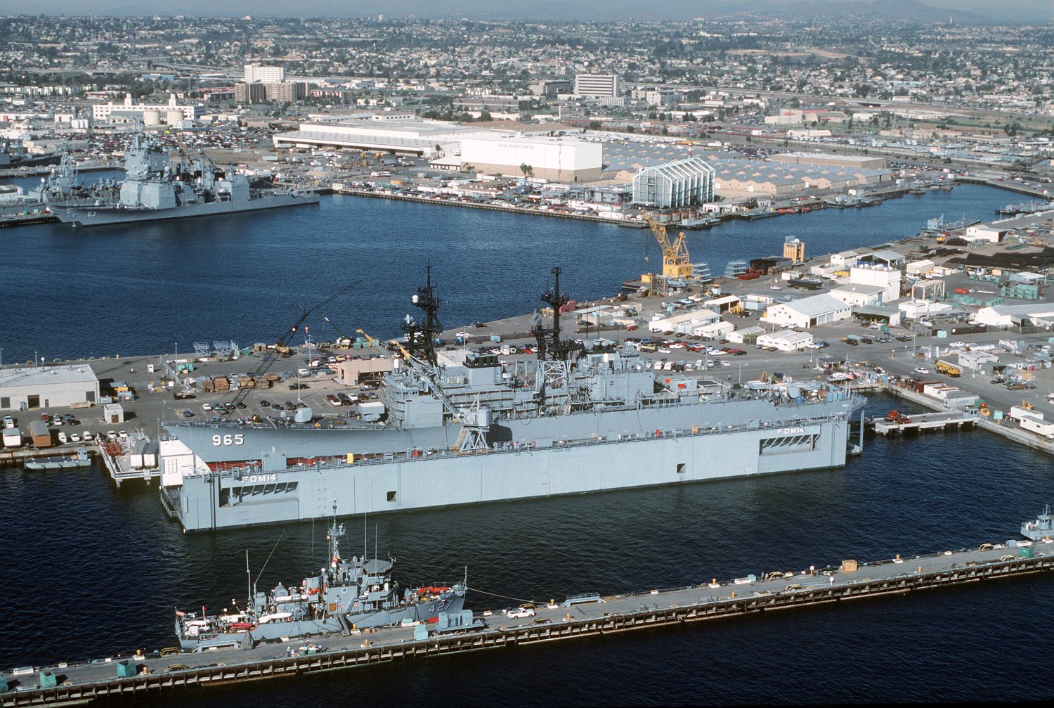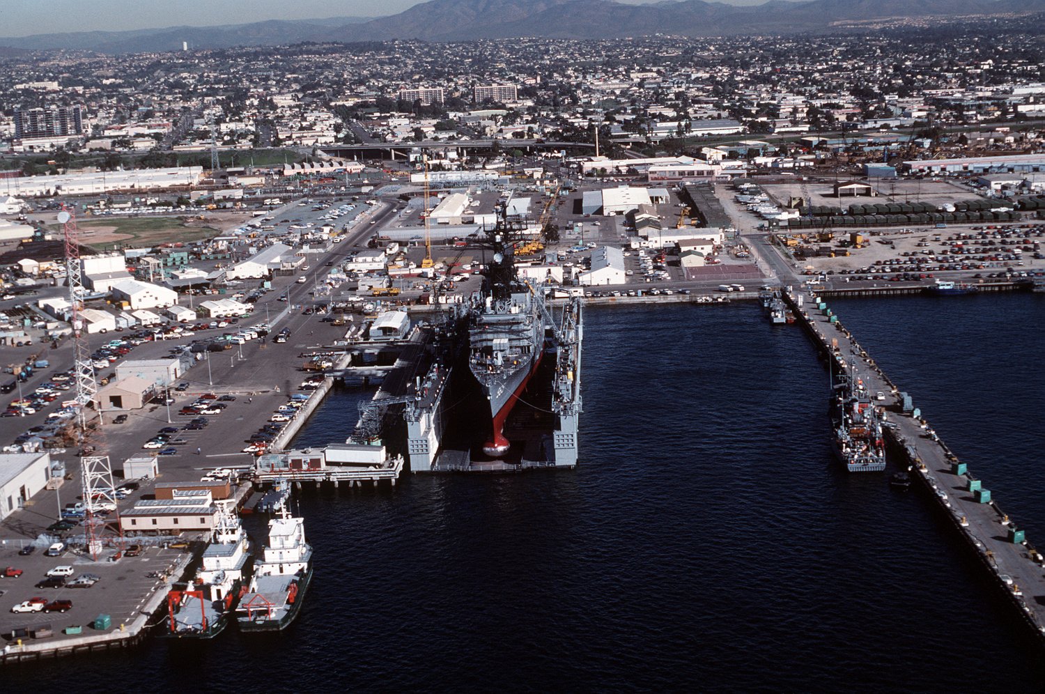 at South Mole Pier, National Steel and Shipbuilding Co, San Diego, CA., 24 January 1992. Note the other ships, yard craft. including