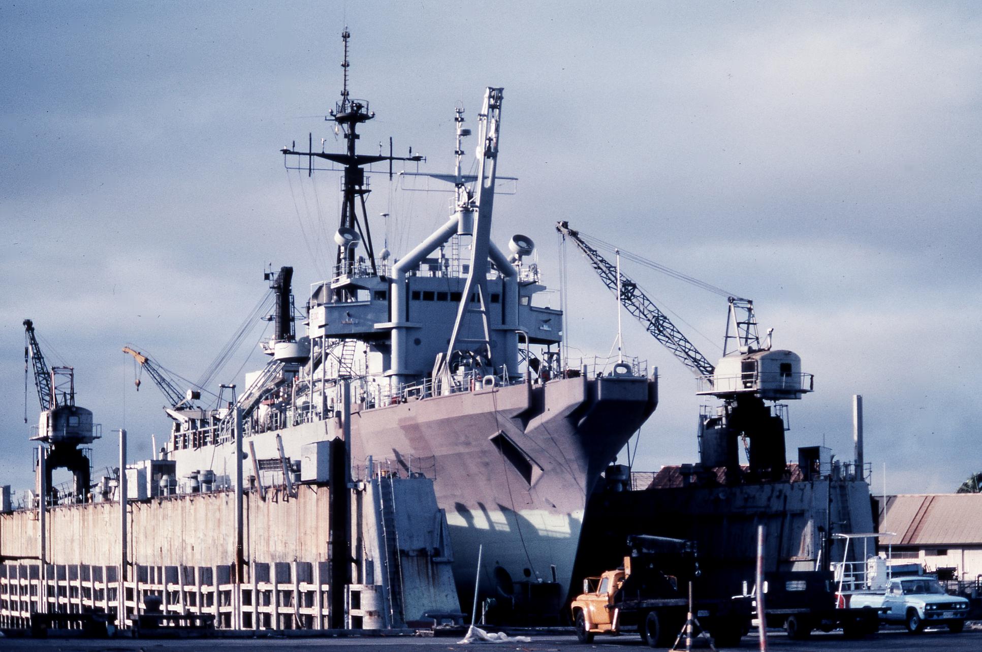 334k | USS Beaufort (ATS-2) drydocked at Pearl Harbor, November 1981. | Photo by Chris Howell, Southland Ship Stores Limited, Port of Bluff, N.Z. | ||