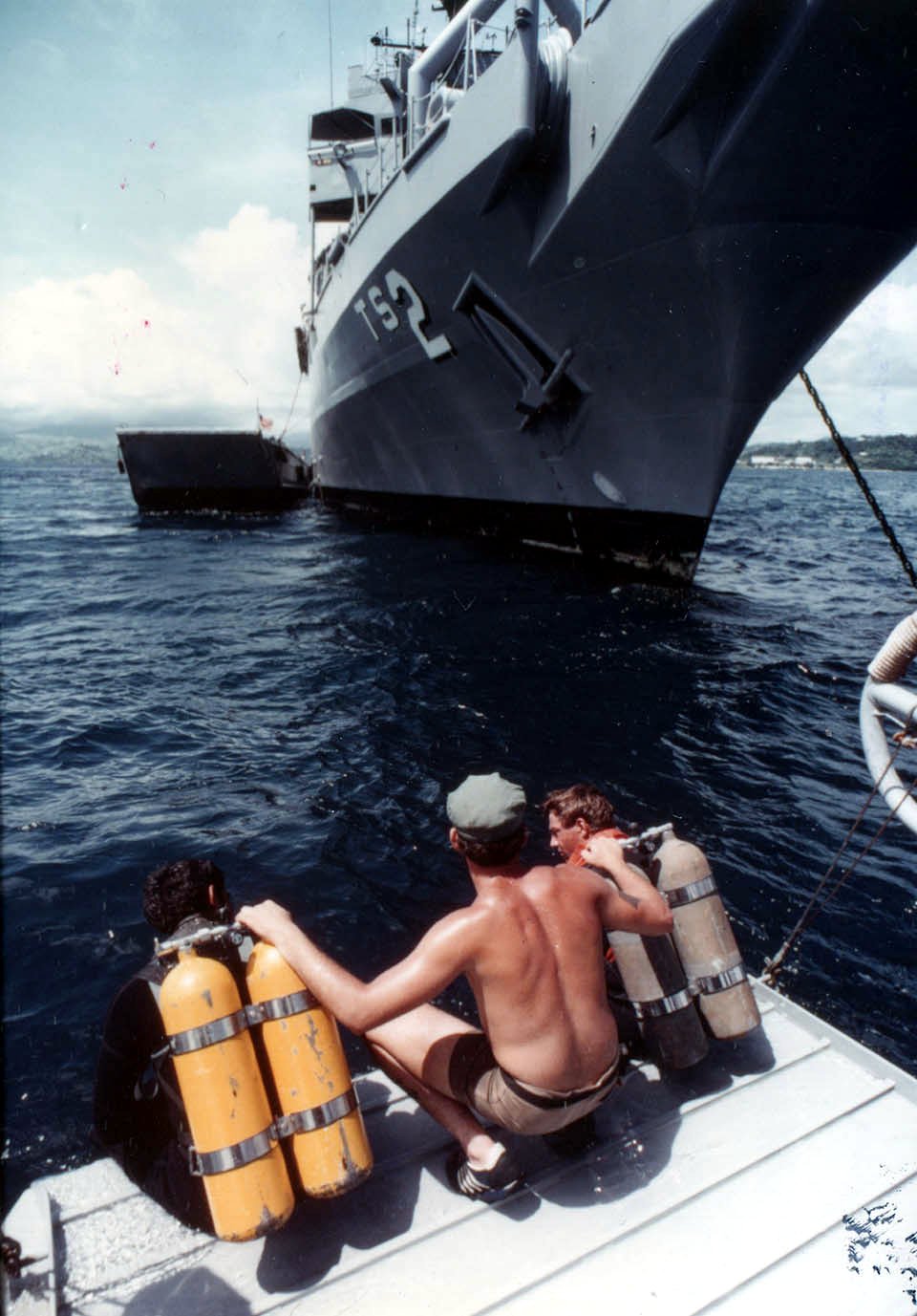 161k | USS Beaufort (ATS-2) divers sit on the bow ramp of a motor work boat with Beaufort's bow overhead, 18 July 1979,