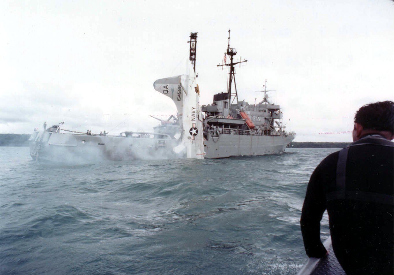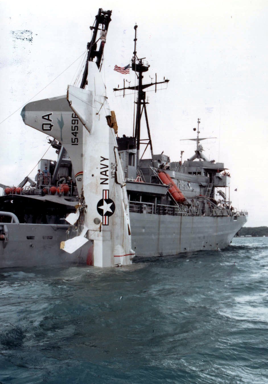that suffered a dual-engine failure in flight and crashed into Subic Bay hangs from USS Beaufort (ATS-2)'s crane during recovery operations, 18 July 1979.