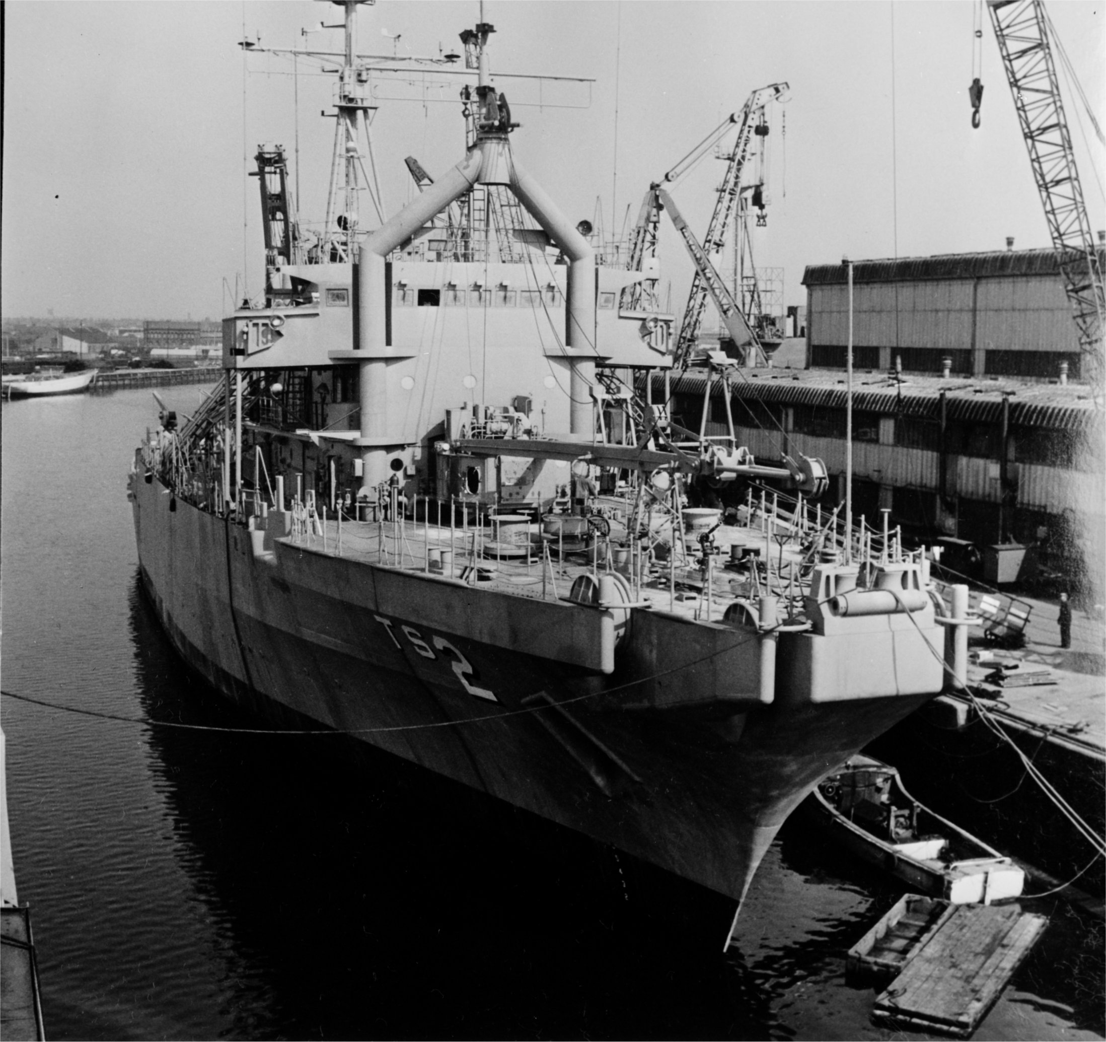 553k | Beaufort (ATS-2) inclining experiment, general topside view from forward, Brooke Marine Limited, Lowestoft, U.K., May 1971