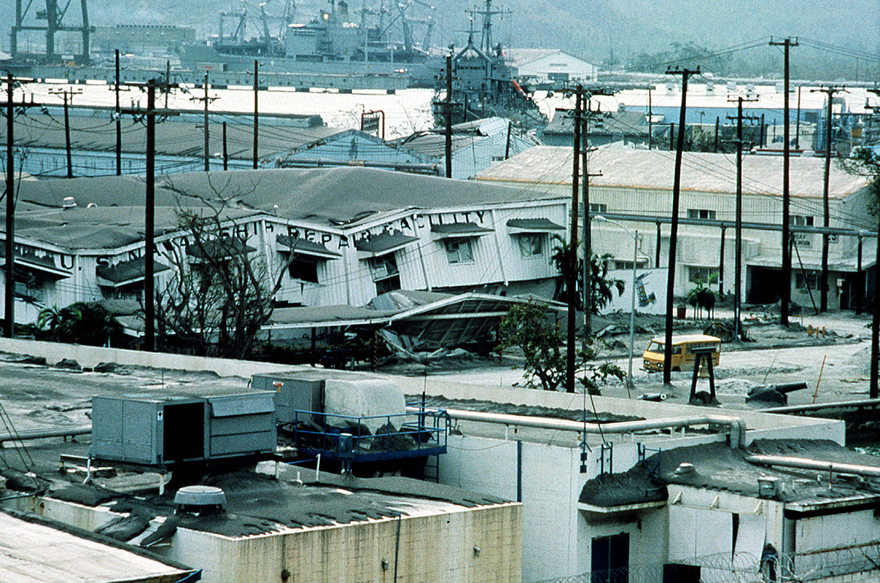 404k | USS Brunswick (ATS-3) moored at Ship Repair Facility, Subic Bay US Naval Base, 22 June 1991. Buildings collapsed under the weight of the four inches of volcanic ash that fell as a result of the June 10 eruption of Mount Pinatubo. More than 20,000 evacuees have been removed from the area as a part of the U.S. military's Operation Fiery Vigil. US Defense Department photo # DN-ST-92-05857, by PH3 Russell A. Michalek, a US Navy photo now in the collections of Defense Imagery. | Robert Hurst | ||