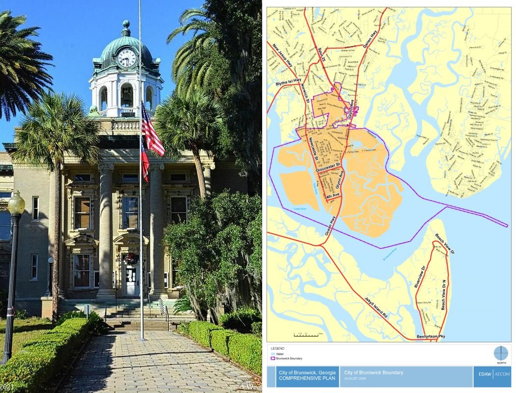 242k | Photo - by ©Lisa Wooten of Brunswick Courthouse Brunswick Georgia, May 2021. Map - City of Brunswick boundary map. |