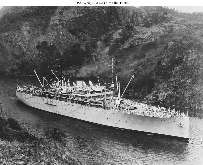 209k | USS Wright (AV-1) transiting the Panama Canal circa 1930s. Note the two seaplanes on deck on the stern. US National Archives, RG-19-LCM. Photo # None, courtesy Shipscribe.com. |