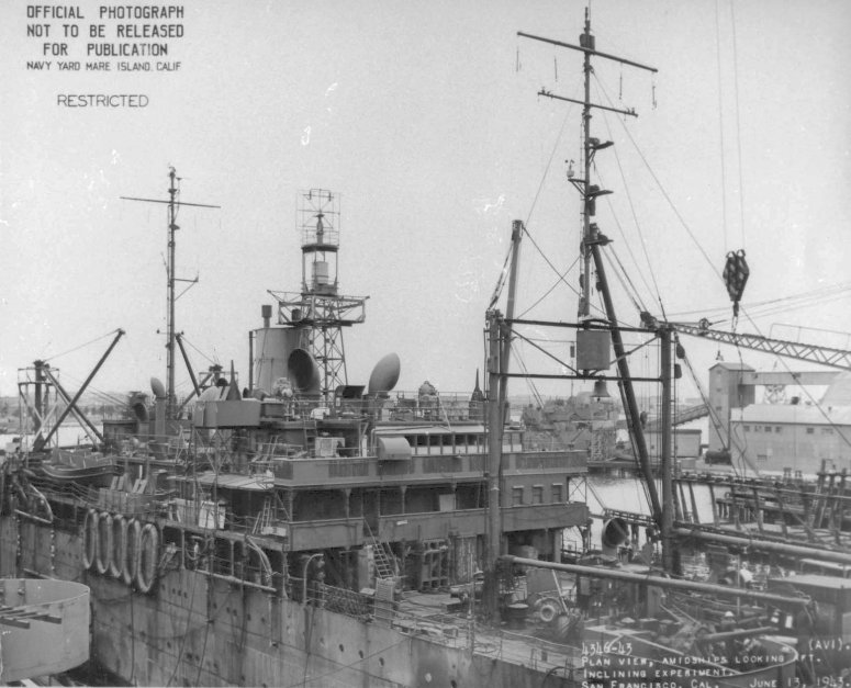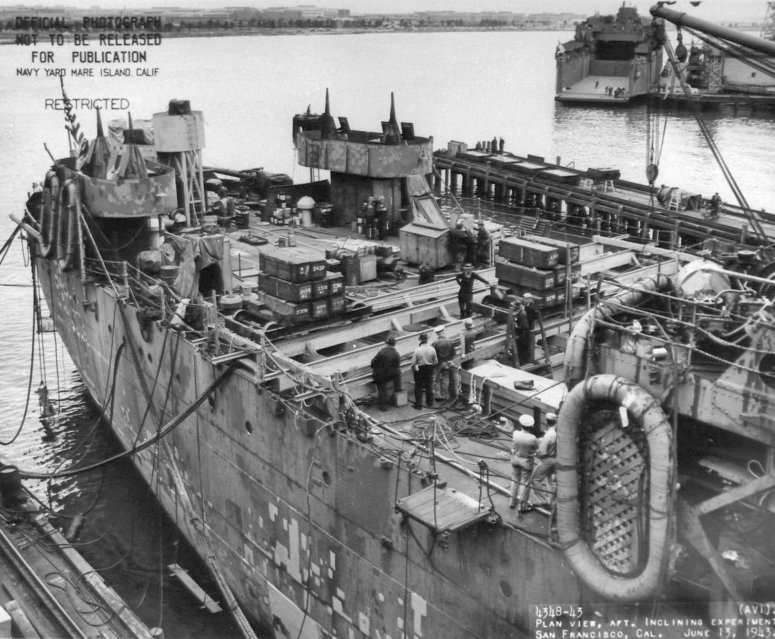 91k | USS Wright (AV-1) at Moore Dry Dock Co., Oakland, CA., while conducting inclining experiments, 13 June 1943.