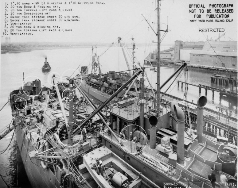 1-U.S. National Archives, photo # 19-N-48392 a US Navy Bureau of Ships photo now in the collections of the US National Archives, courtesy Shipscribe.com, 2-Navy Yard Mare Island photo # 5117-43, 6/13/43 and 3-U.S. Naval Bureau of Ships photo from RG 19-N now in the collections of the Vallejo Naval and Historical Museum, Vallejo, CA. |