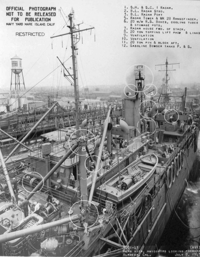 88k | USS Wright (AV-1) off Alameda, Calif., 13 July 1943, after receiving wartime alterations at Moore Drydock Co., Oakland, CA.