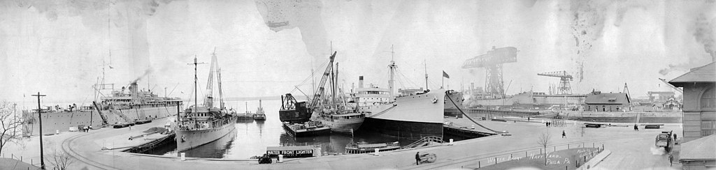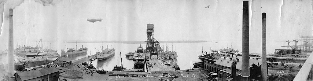 60k | Panorama view of U.S. Navy Yard, Philadelphia, PA., looking out into the Delaware River, circa 1921. Visible ships include (left to right): Lighter-than-Air Aircraft Tender USS Wright (AZ-1); Submarine Tender USS Fulton (AS-1); Collier USS Saturn (AG-4); Cargo Ship USS Gold Star (AK-12); Oiler USS Kaweah (AO-15); Stores Ship USS Yukon (AF-9) and the Destroyer Tender USS Dobbin (AD-3). U.S Naval History and Heritage Command. Photo # S-574-I |