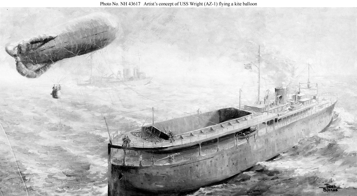 161k | Black and white photograph of a paining by Rose Pastor Stokes, circa 1921 of USS Wright (AZ-1) flying a kite balloon above the ship's open balloon well.