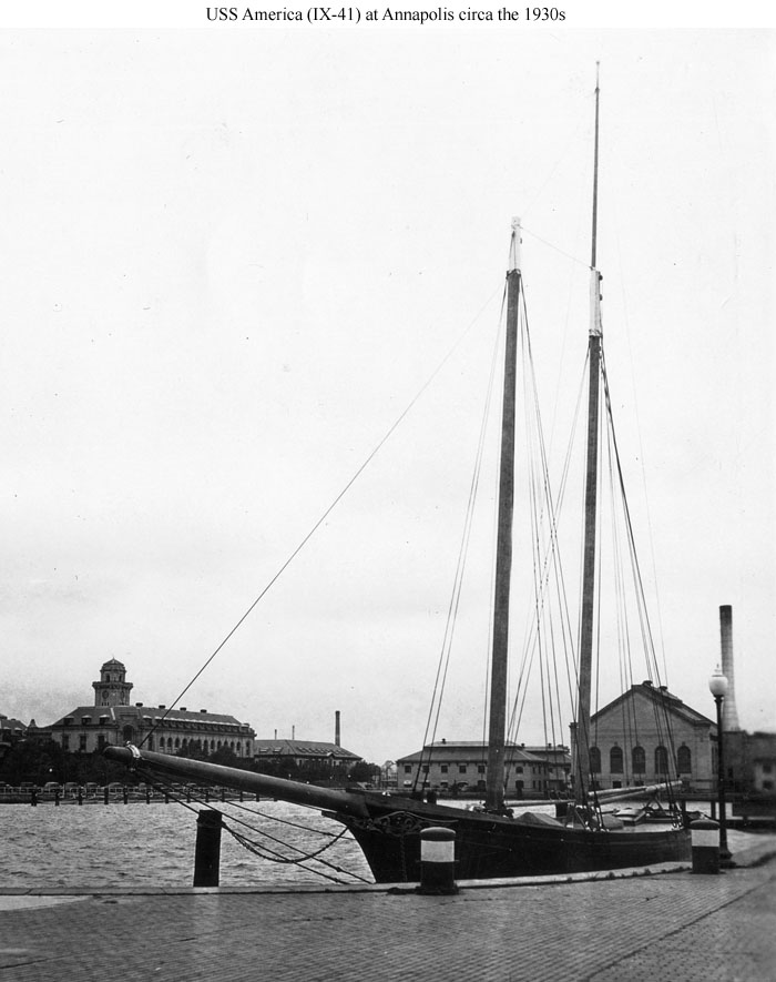 107k | America (IX-41) moored pierside at the US Naval Academy, Annapolis, MD., circa the 1930s. Photo courtesy Shipscribe.com |