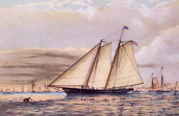 this is not America's rig as that with which she won the £100 Cup in 1851: Donald McKay and Edward Burgess refitted her in 1875 and 1885 respectively.