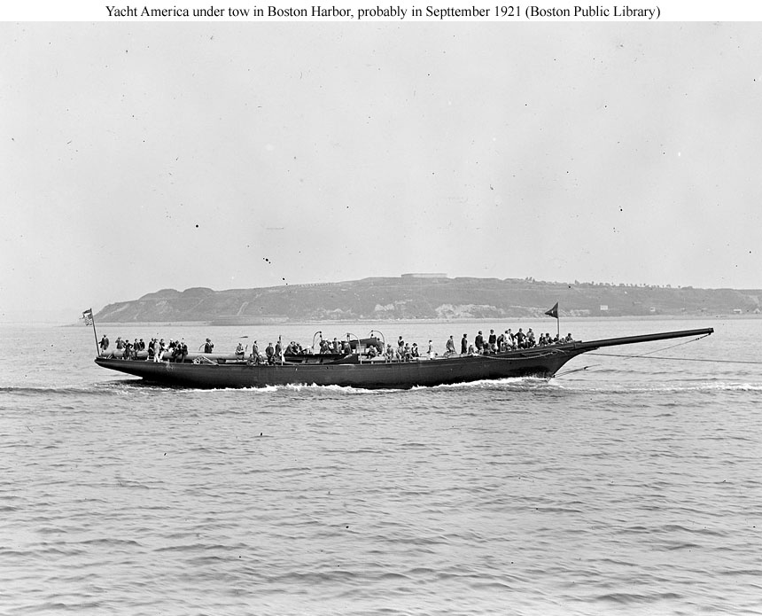129k | Racing yacht America being towed out of Boston Harbor, enroute to Annapolis, MD., in September 1921.