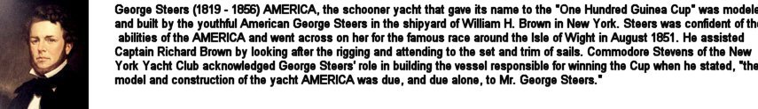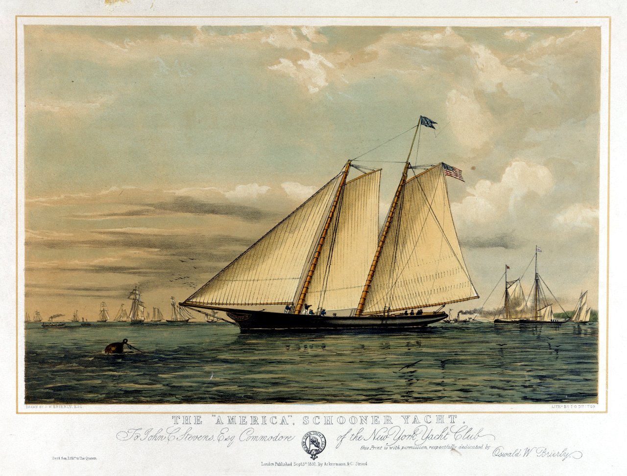 268k | A faithful reproduction America entitled "The America, Schooner yacht". To John C Stevens, esq., Commodore of the New York Yacht Club, 5 September 1851, by Oswald W. Brierly, published by Ackermann & Co. Image courtesy of the National Maritime Museum, Greenwich, London, England. | Robert Hurst | |