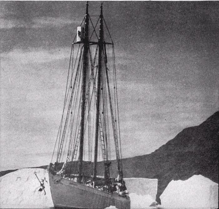 Schooner Bowdoin frozen in the Arctic, 1 August 1923. Note the snow igloos built on the deck of the ship, covering the hatches to retain the warmth.