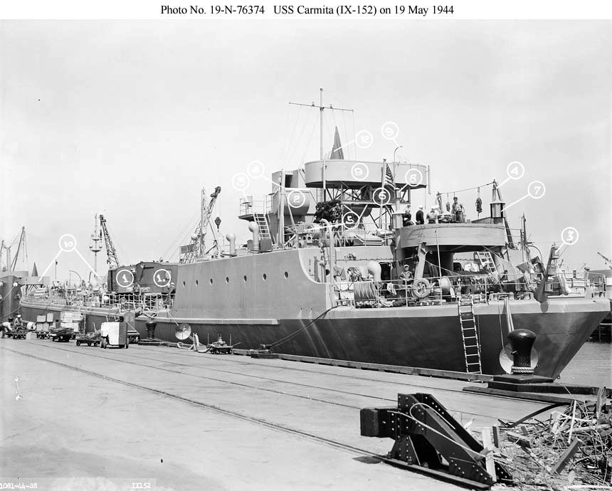 103k | Carmita (IX-152) at San Francisco, 19 May 1944, a week after being placed in service. The numbered alterations include two