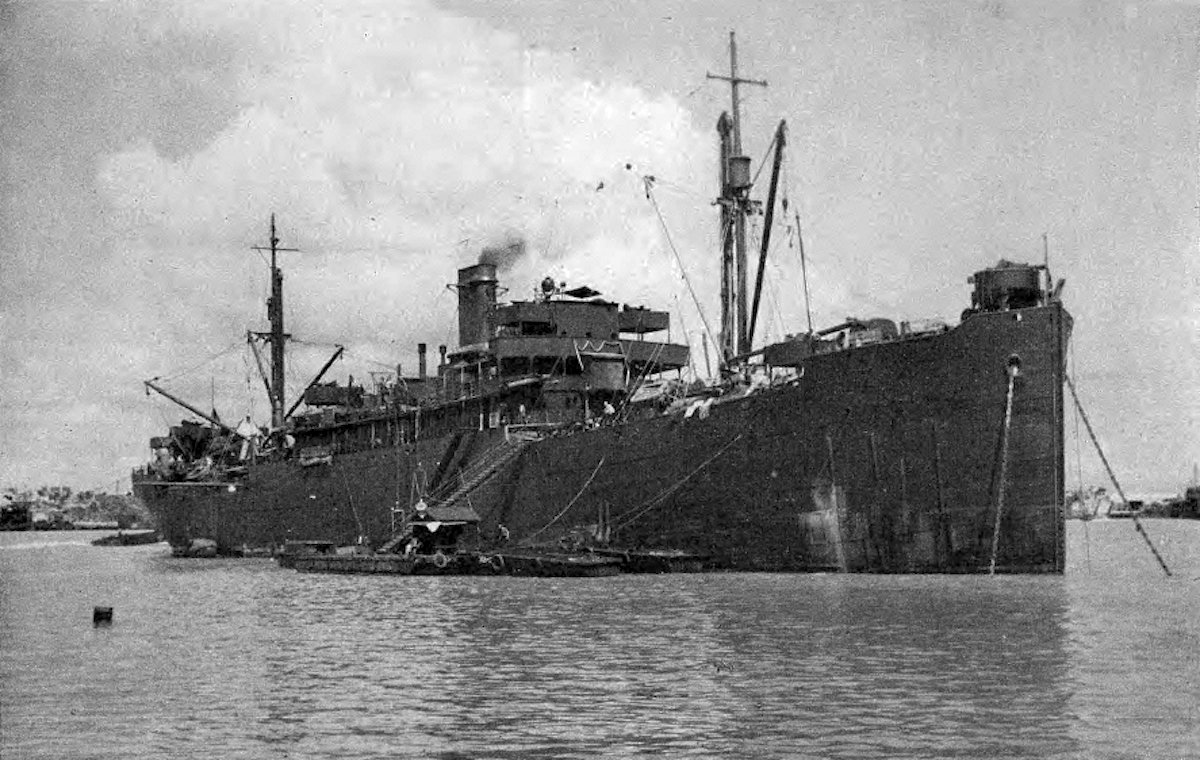 USS City of Dalhart (IX-156), headquarters & base ship for 301st U.S. Naval Construction Battalion, Guam anchorage circa 1944/45.
