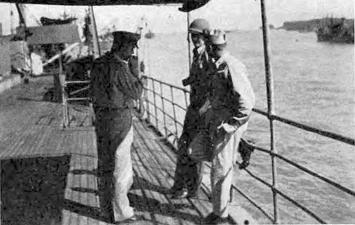 LCDR McKay (Executive Officer NCB 301), LCDR Lokey (Commanding Officer, USS City of Dalhart) and CDR Elliott (Commanding Officer, NCB 301) meet