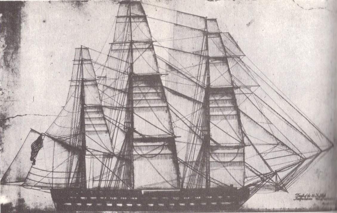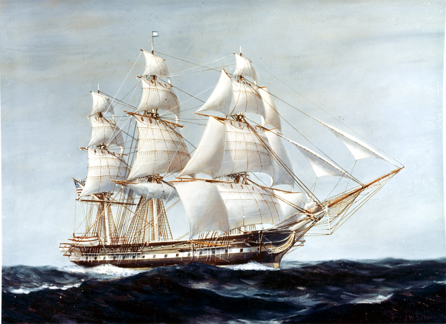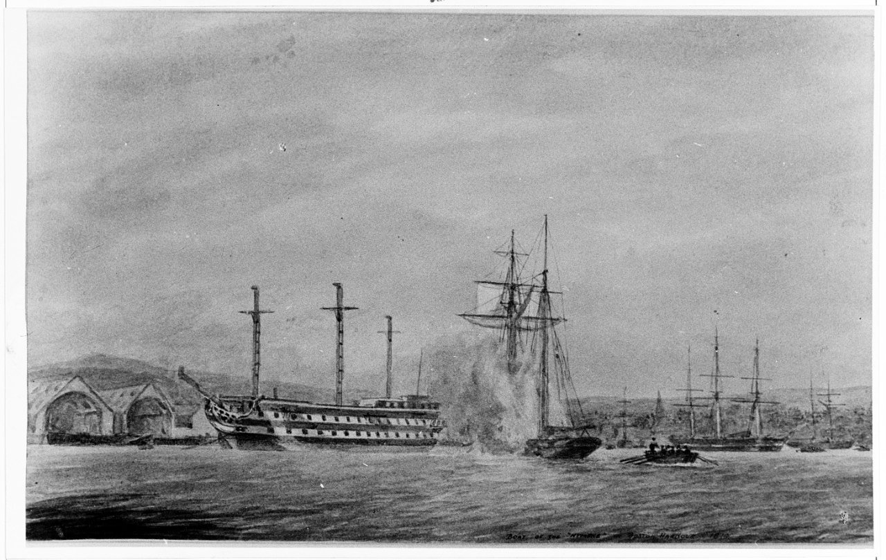 267k | Painting of USS Independence under full sail, after the Ship-of-the-Line was cut down to a 54 gun frigate.