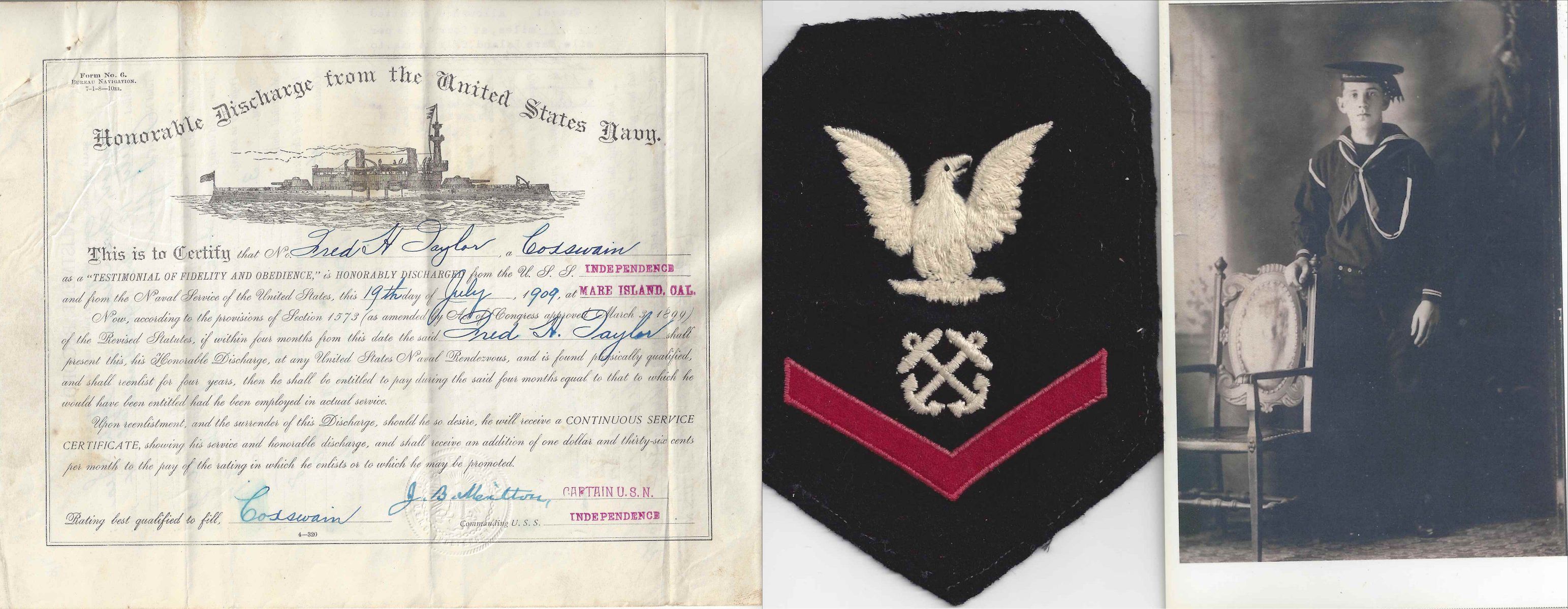 571k | Honorable Discharge Certificate issued to Fred H. Taylor, 18 July 1909 aboard the Mare Island Navy Yard receiving ship USS Independence. Taylor's real was Henry Franz Johann Tramp, he enlisted under the name of Fred H. Taylor at age 16. | Robert Hurst | |