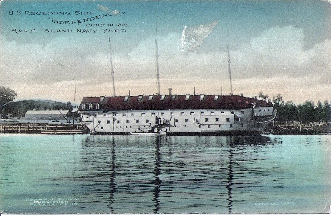252k | Hand colored post card image of Receiving Ship USS Independence at Navy Yard Mare Island, circa 1912-13. Frank J. Stumm, Publisher, Benecia, CA. |