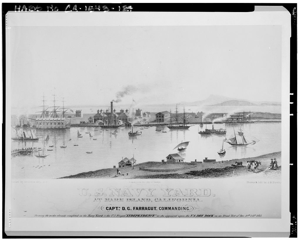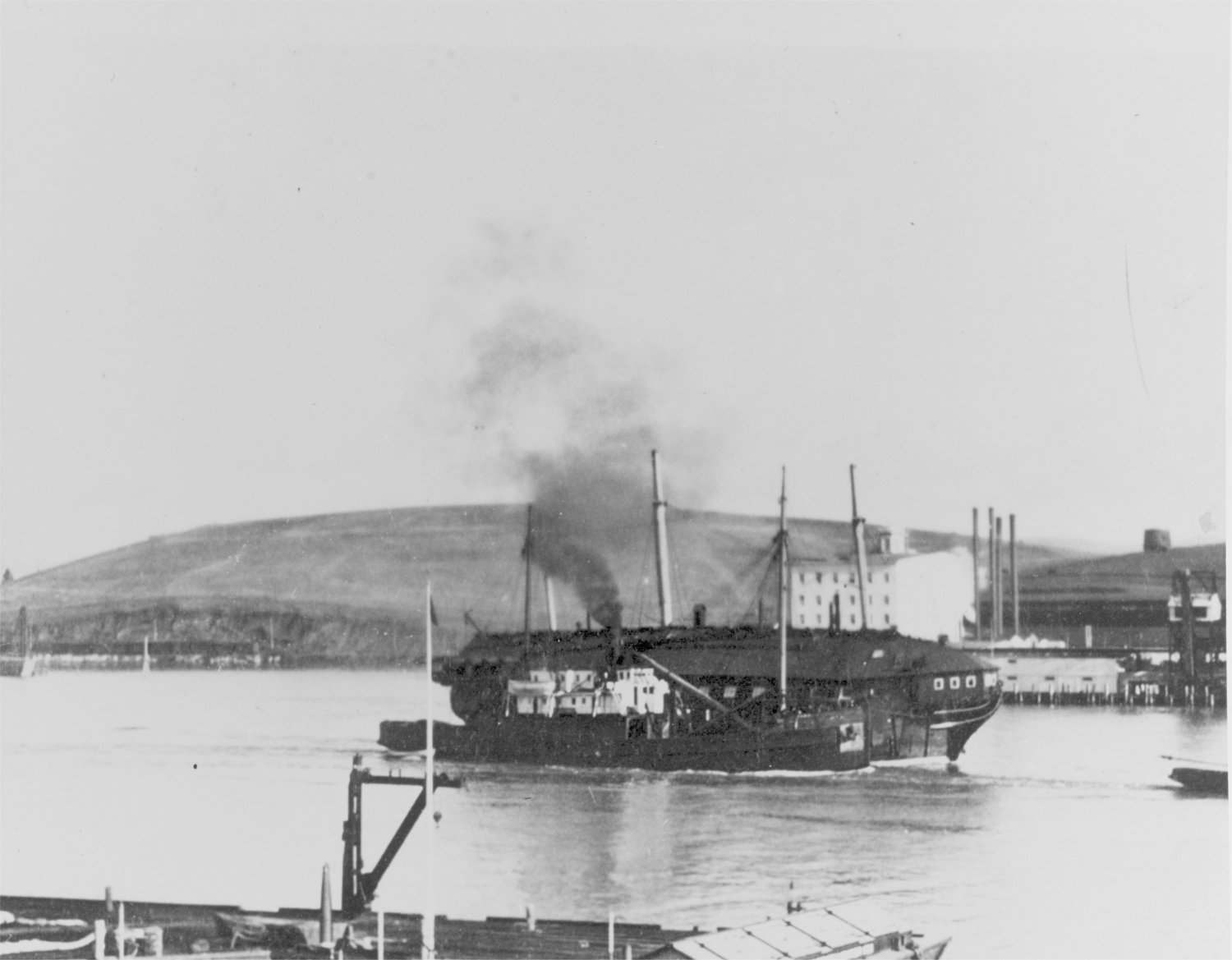84k | View looking along the waterfront of Mare Island Navy Yard during the 1870s, with the city of Vallejo on the opposite side of the channel.