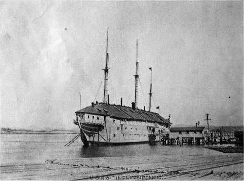 42k | Receiving ship USS Independence moored at Mare Island Navy Yard, Vallejo, CA., prior to her decommissioning in 1912. Photo from Treasure Island Museum , from Warship Boneyards", by Kit and Carolyn Bonner. |