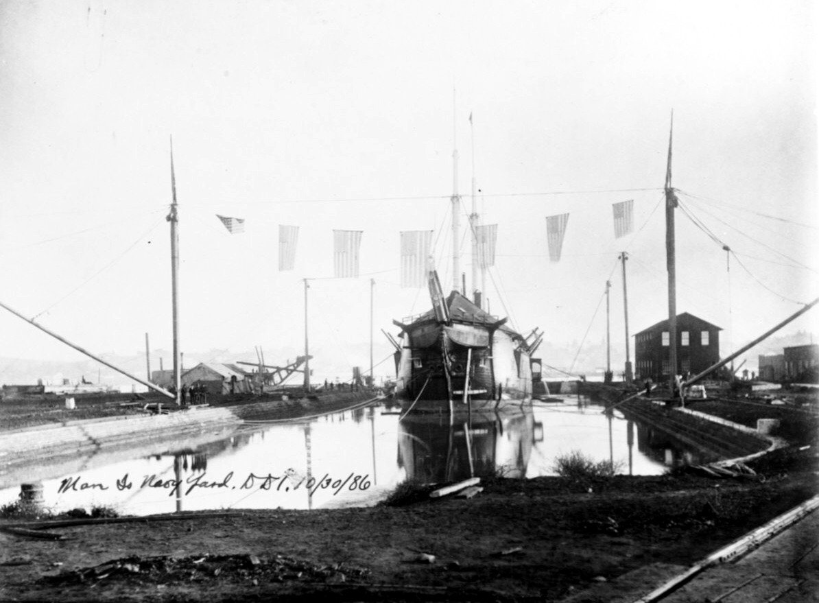 USS Monongahela, outboard of, USS Monadnock (under construction), USS Albatross, USC&GS Carlisle P. Patterson, USS Charleston (C-2) (being outfitted), Floating dry dock and USS Independence (Receiving Ship) Ships in the channel (left to right) USS Alert and USS Thetis. US Navy photo from the collections of the Vallejo Naval and Historical Museum |