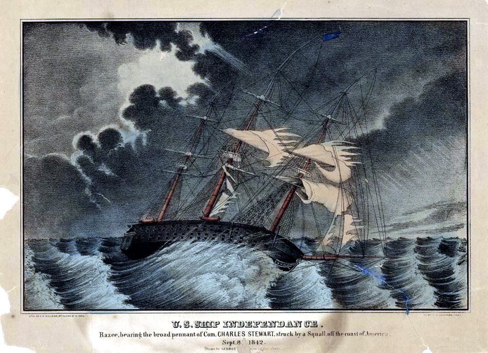 204k | Lithograph of USS Independence bearing the broad pennant of Como. Charles Stewart, struck by a squall off America, 8 September 1842. Kellogg Brothers, lithographers. | Robert Hurst | |