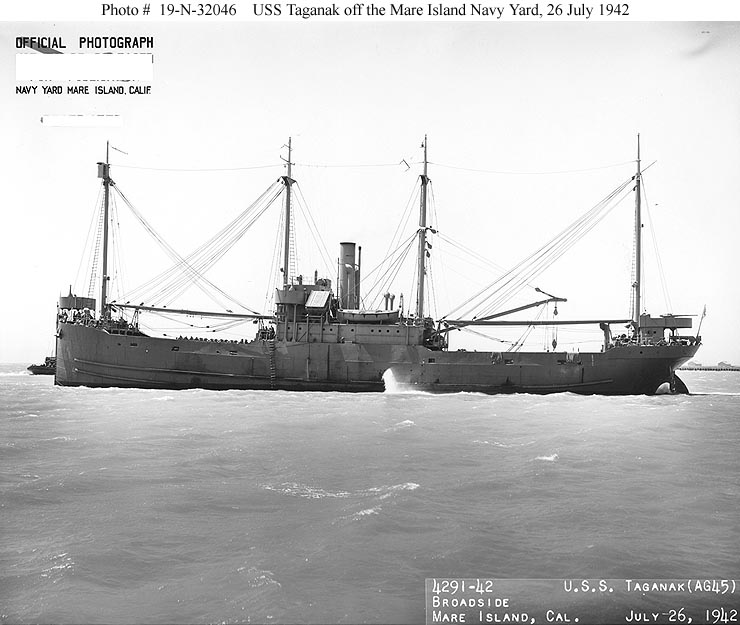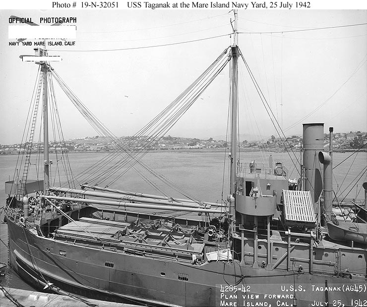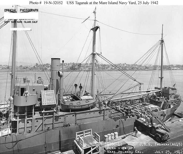 USS Taganak (AG-45) off Mare Island Navy Yard, Vallejo, CA., 26 July 1942. US National Archives photo # 19-N-32046, a US Navy Bureau of Ships photo now in the collections of the US National Archives. |