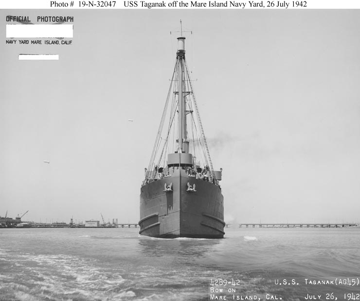USS Taganak (AG-45) bow-on view, taken off Mare Island Navy Yard, 26 July 1942. US National Archives photo # 19-N-32047, a US Navy Bureau of Ships photo now in the collections of the US National Archives. |