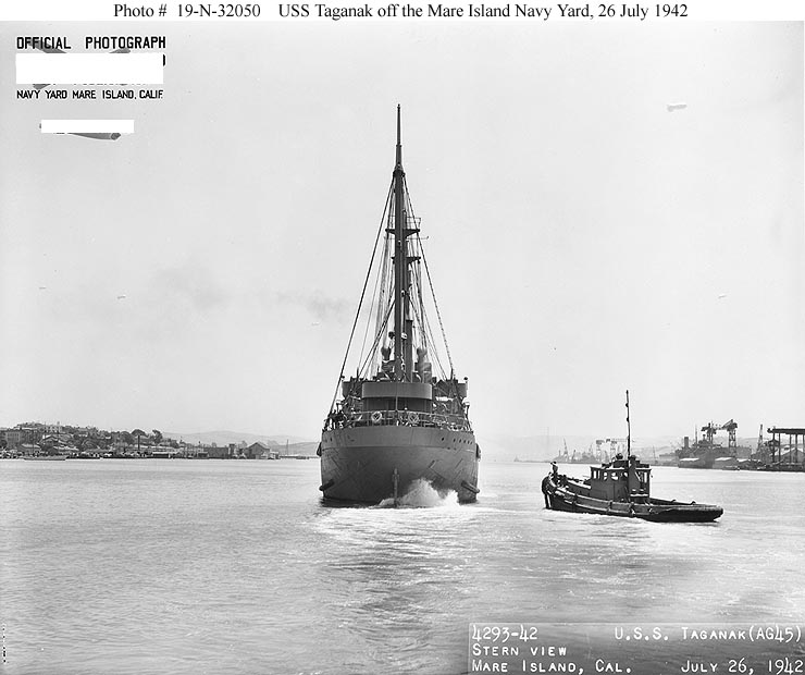 USS Taganak (AG-45) viewed from astern, with a motor tug nearby, while off the Mare Island Navy Yard, 26 July 1942. US National Archives photo # 19-N-32050, a US Navy Bureau of Ships photo now in the collections of the US National Archives. |