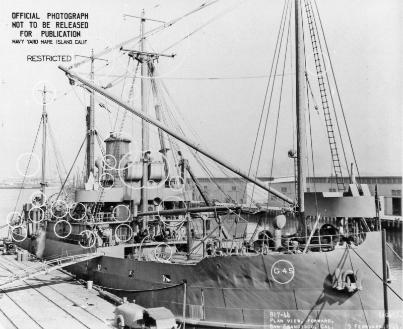 Forward plan view of USS Taganak (AG-45) at Oakland, CA., 5 February 1944. Navy Yard Mare Island photo # 817-44. |