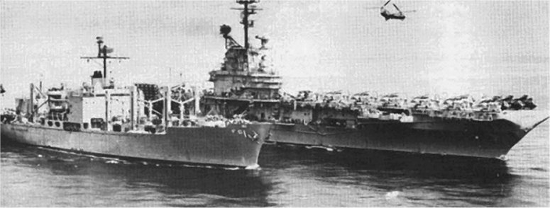 1034k | USS Mars (AFS-1) conducting a Vertical Replenishment (VERTREP) with USS Constellation (CV-64), circa 1981-82. | Photo by Paul Jarvis USS Constellation | |