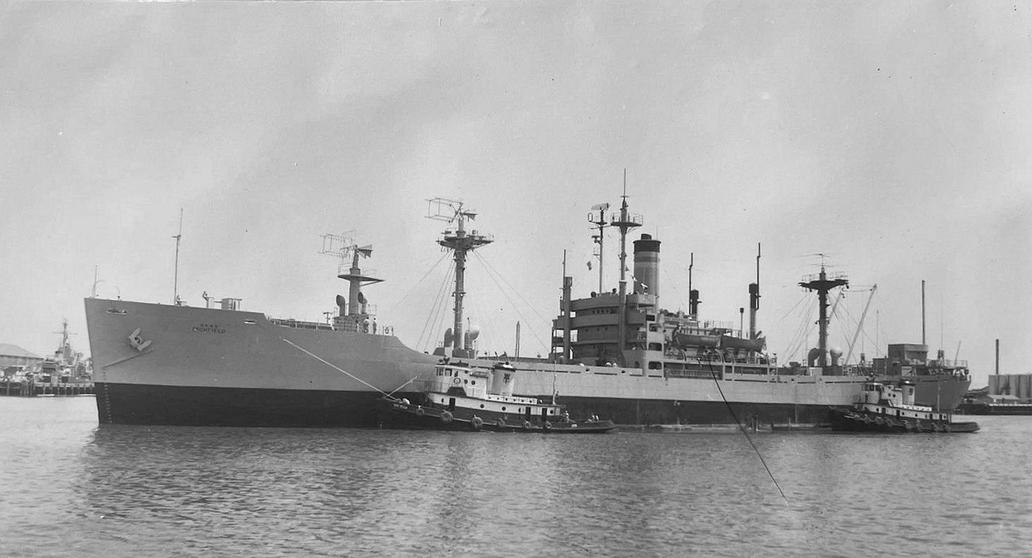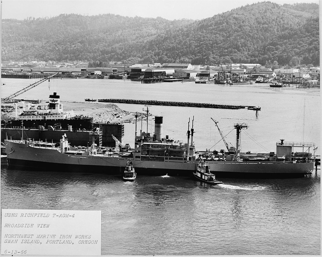 broadside view of the Missile Range Instrumentation Ship USNS Richfield (T-AGM-4) at Northwest Marine iron & Steel Works, Swan Island,