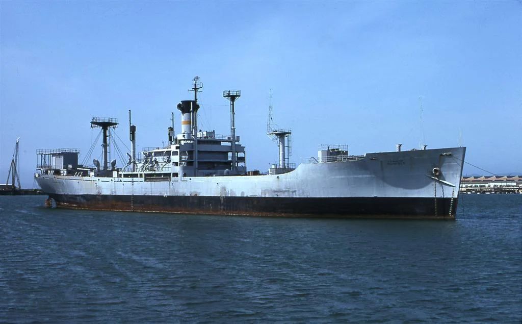 Ex-USNS Richfield (T-AGM-4) laid up in the National Defense Reserve Fleet, Suisun Bay, CA., date unknown.