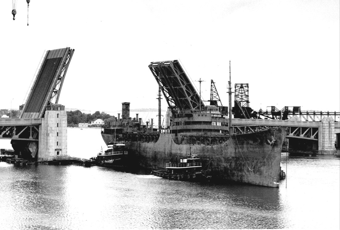 154k | Mission San Fernando, under tow entering the Quincy, MA. shipyard for conversion to a Missile Range Instrumentation Ship USAF photo from Patrick AFB archives. |