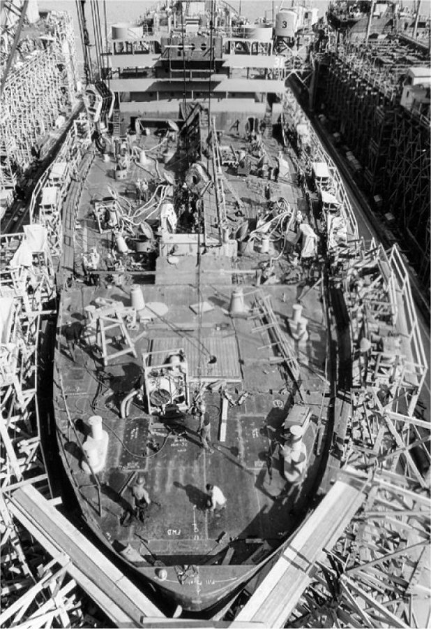 17k | Mission San Fernando in drydock at Quincy. Only her bow and stern were retained in the construction of (T-AGM-19) USAF photo from Patrick AFB archives. |