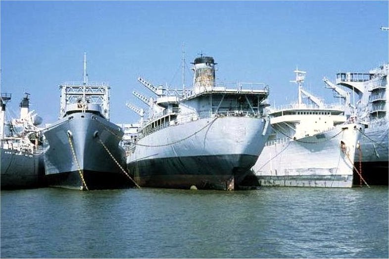 USNS Mississinewa (T-AO-144) and ex-USNS Vanguard (T-AG-194) moored at the National Defense Reserve Fleet, James River, date unknown. |