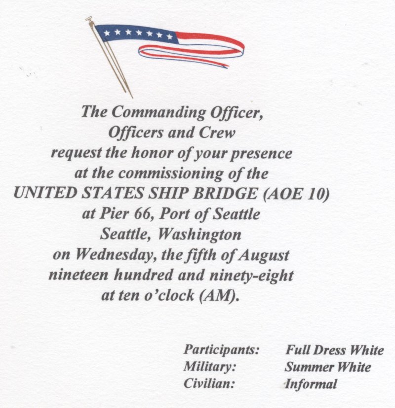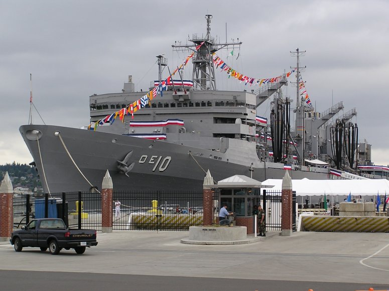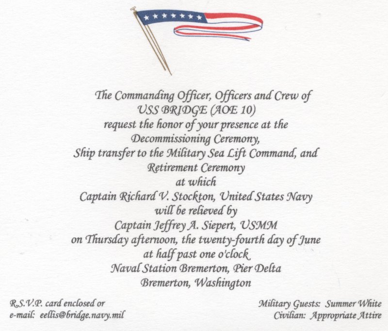 90k | USS Bridge (AOE-10) is decked out with bunting and signal flags for her transfer from the US Navy's combatant Fleet to Military Sealift Command's combat logistics fleet 24 June 2004 at the Naval Base in Bremerton, WA. US Navy photo |